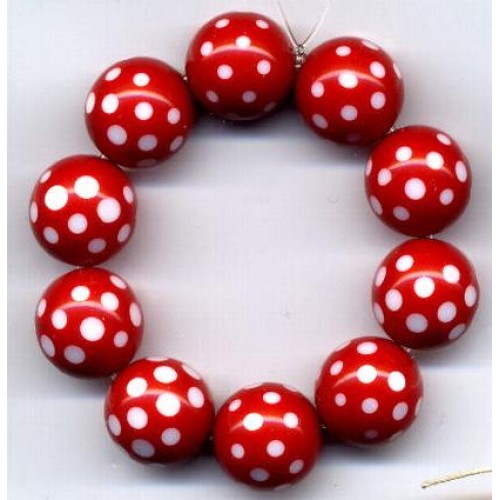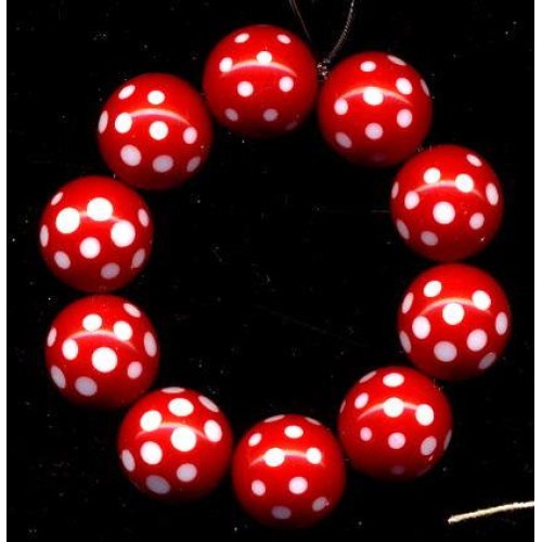 10 very cool red red vintage Lucite beads with white faceted dots. The white dot has a slice across the surface so it sparkles. Each bead measures 14mm.