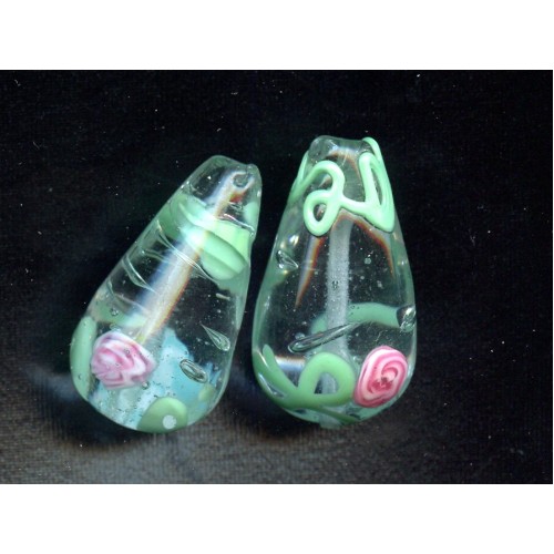 These lovely Vintage Venetian Floral Drops measure 34mm long and are 18mm at their widest point. Each is decorated with lovely pink flowers and green vines in a clear base and match the Vintage Venetian Floral Cabochon Stones pictured below. The hole runs through the bead from top to bottom. There are two of these beauties in this lot.