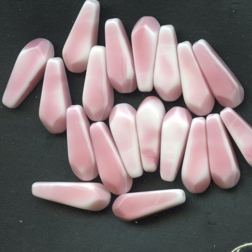 These delightful vintage beads feature four flat sides with a pink and white swirl pattern. Each bead measures 22mm by 8mm at the widest point, with a hole running from top to bottom. There are 10 beads per lot.