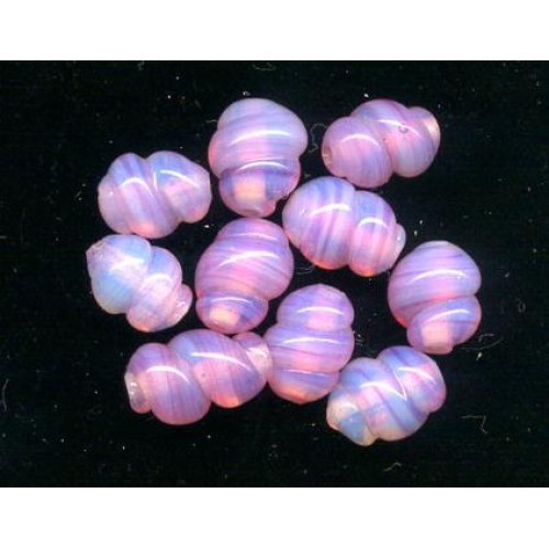 10 beautiful vintage glowing opalescent curls in a lovely soft pink. They really do glow! Each bead measures 11mm x 9mm.