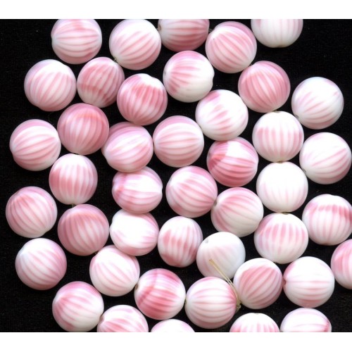 These very shiny lined Pink and White Vintage beads measure 12mm round by 5mm thick. There are 15 beads offered per lot