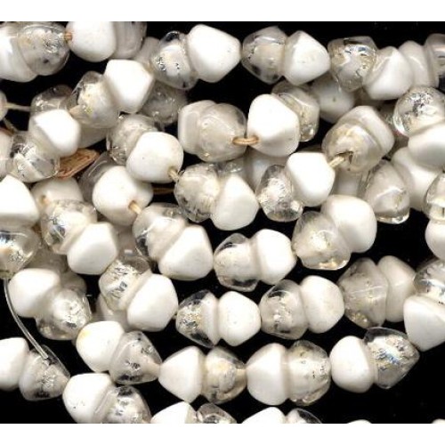 Each lot contains 12 unusual vintage beads measuring 14mm x 10mm. Beads look like 2 part beads but they are actually 1 piece. One side white the other clear with white and silver foil.