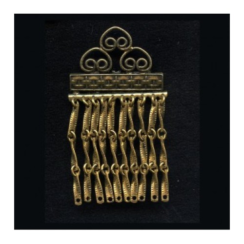 This Beautiful Vintage Brass Brooch has lovely scroll work designs with 10 hanging pieces of chain. Each chain has holes on the bottom on which to hang tiny beads or crystals. The brooch is 32mm x 60mm (including top design). This is a One of a kind piece from the 1940's.