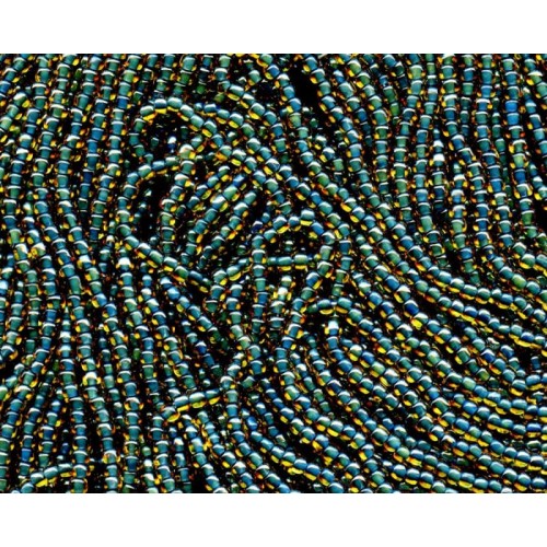 Each of these sparkling Vintage beads measures 4mm. The outer layer is a translucent Topaz and the centers are a blue that resemble saphiret glass. There are 2 strands in each lot. Each strand has aproximately 166 4mm beads. When held up to the light they sparkle like crazy. Beads are all on original strings.