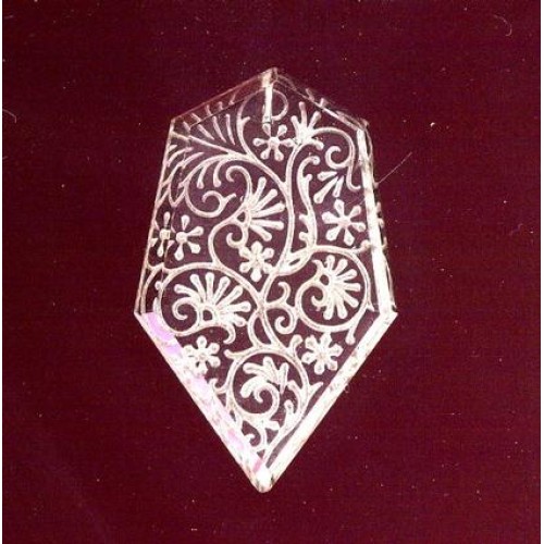 A magnificent etched drop from the 1920's. This beauty has an etched design on one side and a smooth shine on the other. The edges are beveled. Upeye needed with this drop . It measures a grand 52mm x 32mm x 7mm thick.