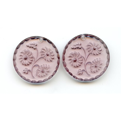 This lovely Vintage light purple round etched pendant has a lovely spray of flowers on one side. The opposite side is smooth glass. It is edged with a scalloped design and measures 30mm around and is 5mm thick. with a hole on the top of each. There are two of these lovely pendants in this lot.