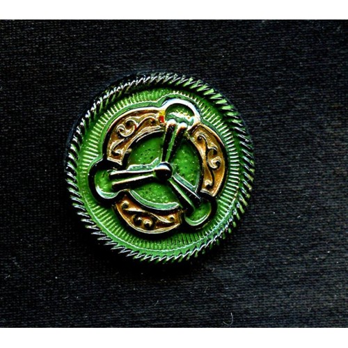 Discover this rare 1930's Green and Black Czech Medallion, a unique vintage piece measuring 28mm in diameter. The medallion features a flat back with a 6mm lip around its circumference and two holes on either side, making it ideal for creating stunning pendants, necklaces, or bracelet centerpieces. The raised design adds a touch of elegance to any jewelry project. Don't miss out on this exquisite find for your next jewelry-making endeavor!