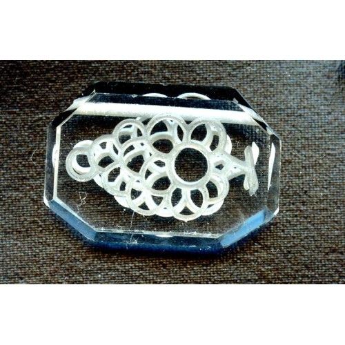 This lovely Vintage clear glass pendant measures 32mm x 25mm x 6mm thick. The hole runs horizontally across the top of the pendant. It is faceted on its edges, designed with circles on both sides and is in mint condition.