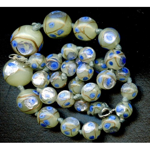 This gorgeous pale yellow Vintage necklace is 15 inches long and is made up of beads with little blue roses, silver foil and swirls of Aventurine. The largest bead measures 14mm. A real Beauty!