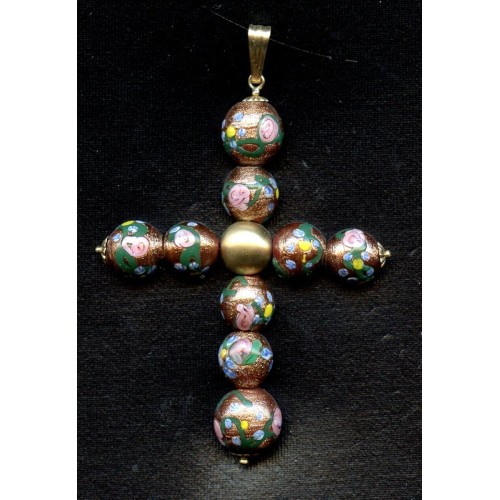 This Amazing Vintage Venetian Floral Cross was made with gold filled findings and measures 2 7/8" long (including bale) x 2" wide. Beads are covered in Goldstone and decorated with applied pink roses, leaves and blue and yellow flowers. This piece is magnificent on a ribbon or a chain. Makes a beautiful Mother's Day gift.