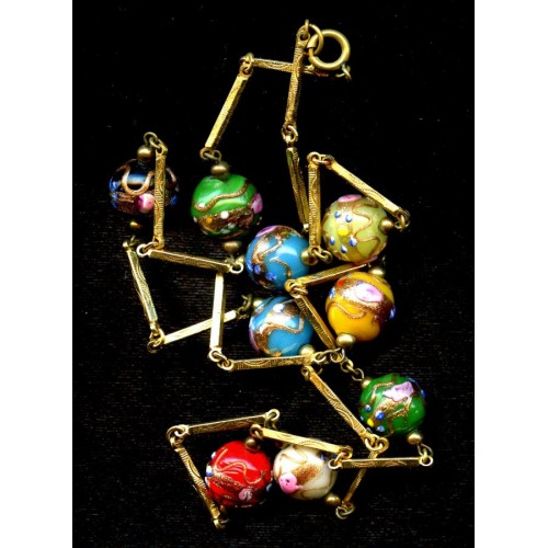 This beautiful Vintage Venetian Wedding Cake Necklace measures 28 inches long. There are 9 12mm Venetian Wedding Cake beads each with applied roses, a band of aventurine, an applied dots of color. The lovely chain has an etched design on all 4 sides. It is in MINT condition.