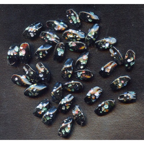 These Three sided Vintage Black Beauties are loaded with sparkling bits of colored foil.  Each bead measures 14mm long and 6mm wide.  There are 14 beads in this lot.