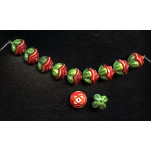 These wonderful two piece Red flower beads measure 13mm x 14mm. There are 18 beads pieces, (9 flowers and 9 caps/leaves), that make up each of 9 beads in each lot.
