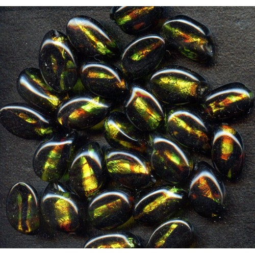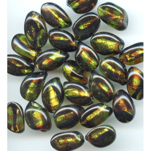 These Vintage chocolate beads are filled with green, rust, and gold colored foils. Each 3 sided bead measures 18mm x 12mm. There are 8 beads per lot.