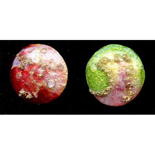 These Limoge pieces are amazing. They measure 35mm. The enamel has raised drizzels of gold and is totally covered with a layer of glass and clear glass teardrops. Stunning! The back is hand signed in gold. Emaux E.J. Guitard Limoges France. Available in both Brick and Green/Rose
