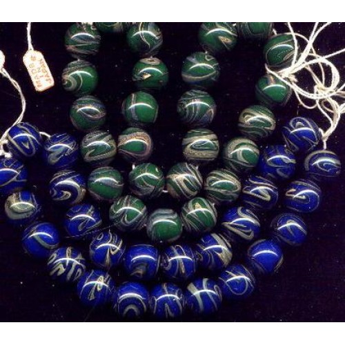 7 wonderful vintage Japan Cobalt beads that look like the planet earth. Swirls of greenish gray on shiney cobalt. Beads measure 12mm. Also available in deep green with greenish gray swirls.