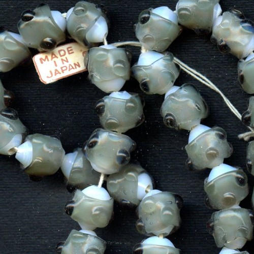 Here are 11 beautiful opalescent white vintage Japanese beads with an applied bumpy smokey grey band.  Each measures 9mm on original strings with tags