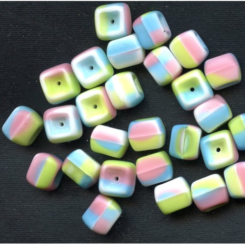 There are 15 colorful indented cubes of aqua, pink, and white offered in this listing. Each bead measures 8mm x 10mm.