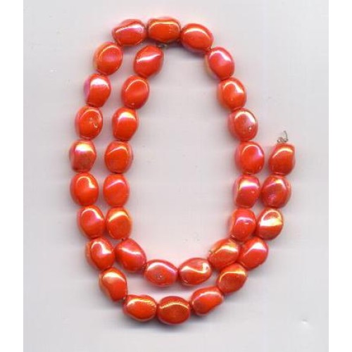 35 vintage West German coral colored iridescent beads measuring 10mm x 7mm. Beautiful sparkling shine on these.