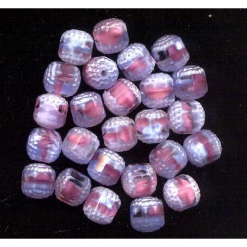 There are 13 Gorgeous vintage beads with 10 shiny facets going all around the bead. They look like windows. Each end has an edge that is frosted with a raised design. Beads measure 12mm x 12mm. The color is a lovely swirl of light raspberry and blue.